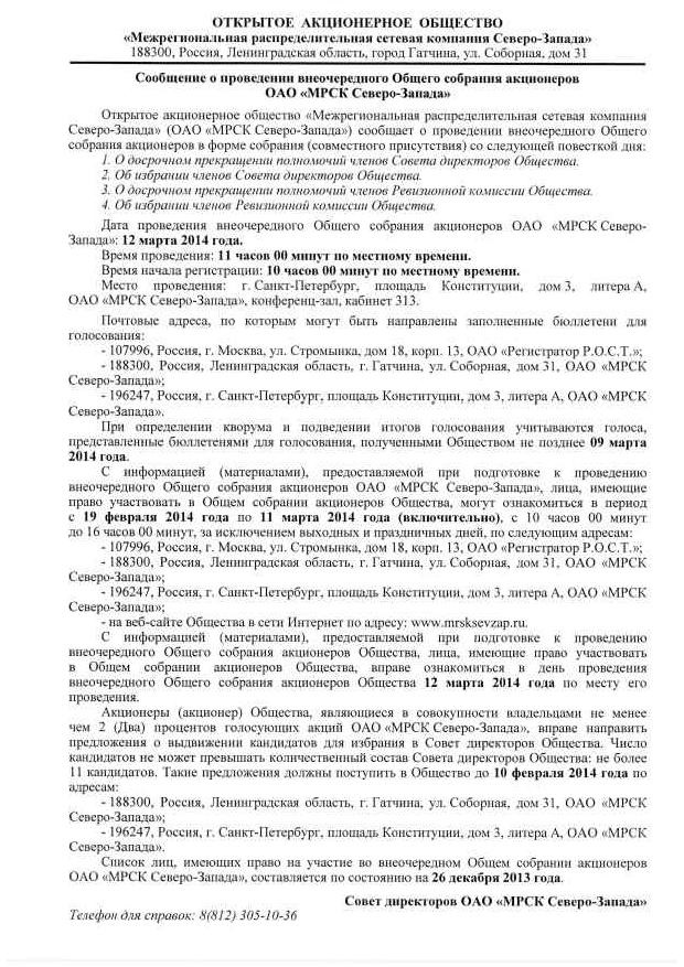 • Сообщение о проведении внеочередного Общего собрания акционеров